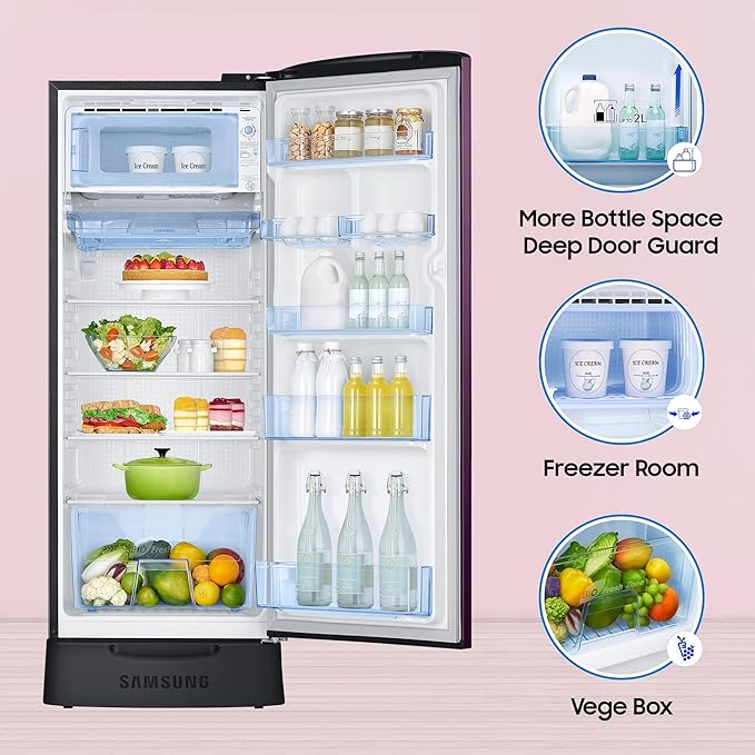 Samsung 223 L, 3 Star, Digital Inverter, Direct-Cool Single Door Refrigerator (RR24C2Z23CR/NL, Camellia Purple, Base Stand Drawer, 2023 Model)